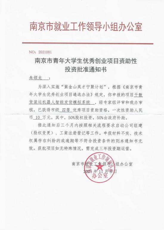 机电工程学院扎实推进学生创新创业能力培养,结合教师科研项目,组建了多个科技创新小组,开展了系列科教融合实践活动。在于继明副教授的指导下,朱领龙同学带领三名同学成立“励志科创小组”,创立了南京菁宇科技信息有限公司,入驻sjb世俱杯官方网站国家创客中心,并获得省级大学生创业重点项目1项,获得专利授权两项。朱领龙同学团队申报的2021年南京市青年大学生优秀创业项目获得南京市“紫金山英才宁聚计划”资助10万元。