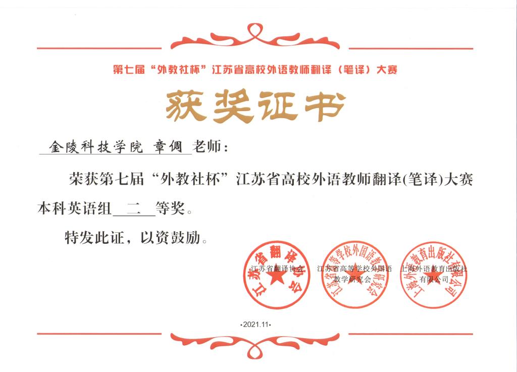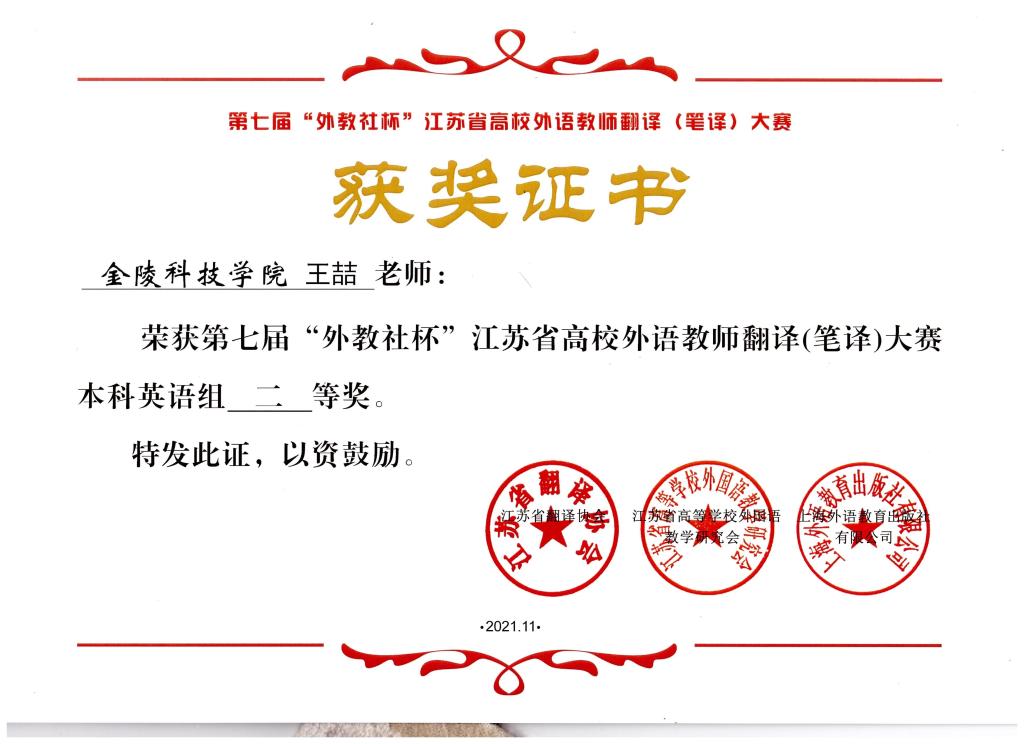 11月26日–27日,第七届“外教社杯”江苏省高校外语教师翻译(笔译)大赛暨颁奖典礼线上成功举行。sjb世俱杯外国语学院教师王喆、章倜喜获二等奖。