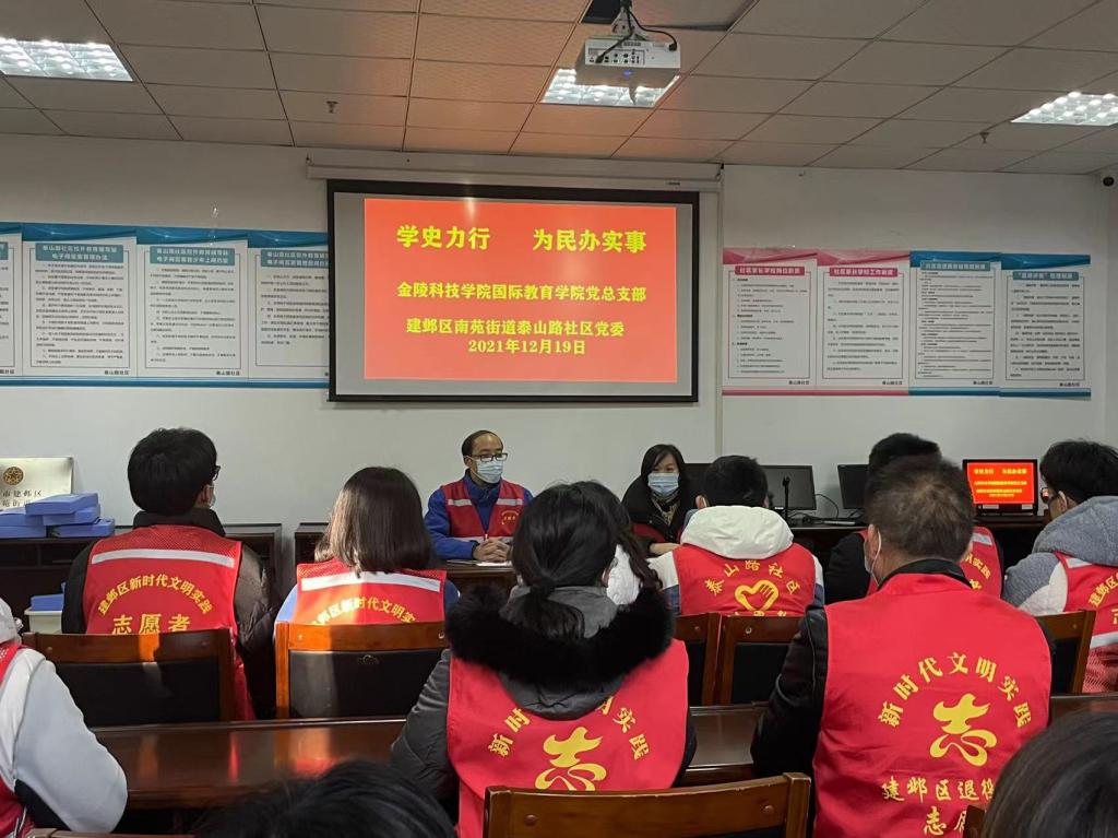 为扎实有效推进党史学习教育,建立兼容开放的联建联学机制,促进资源共享,实现优势互补,12月19日,国际教育学院党总支部与南京市建邺区南苑街道泰山路社区党委在社区举行了结对共建签约仪式。