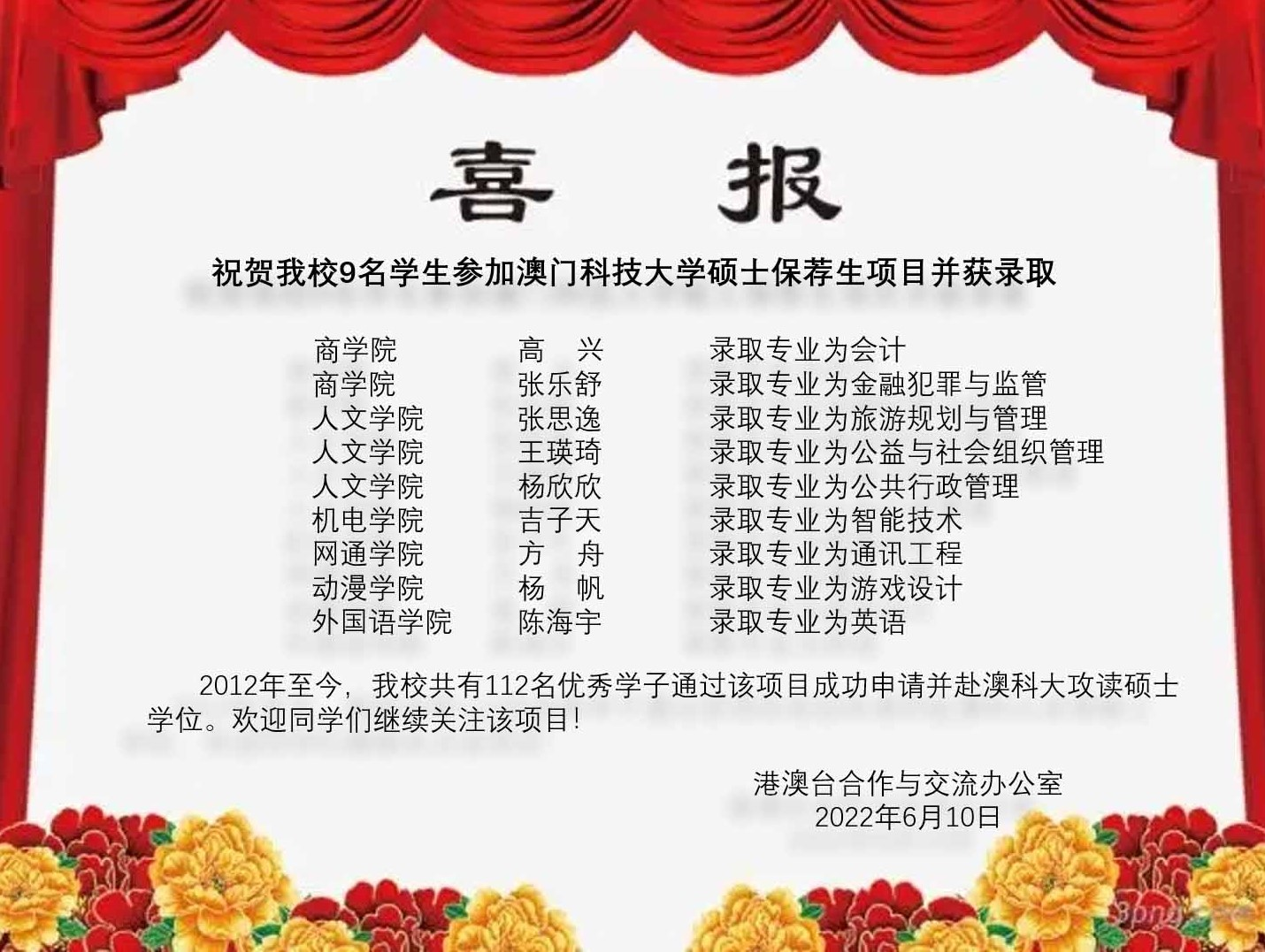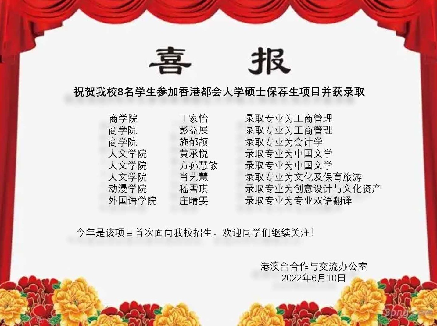 近日,香港都会大学、澳门科技大学2022届硕士保荐生录取工作圆满结束,商学院丁家怡等8名同学参加香港都会大学硕士保荐生项目并被录取,商学院高兴等9名同学参加澳门科技大学硕士保荐生项目并被录取。