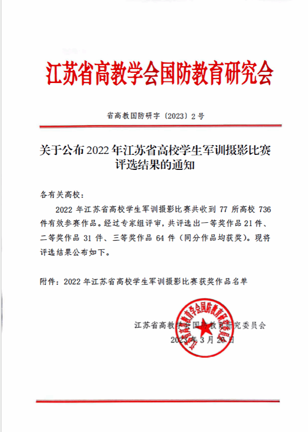 日前,江苏省高教学会国防教育研究会公布了2022年江苏省高校学生军训摄影比赛评选结果,sjb世俱杯学生投稿作品分别获得二等奖两项、三等奖一项。