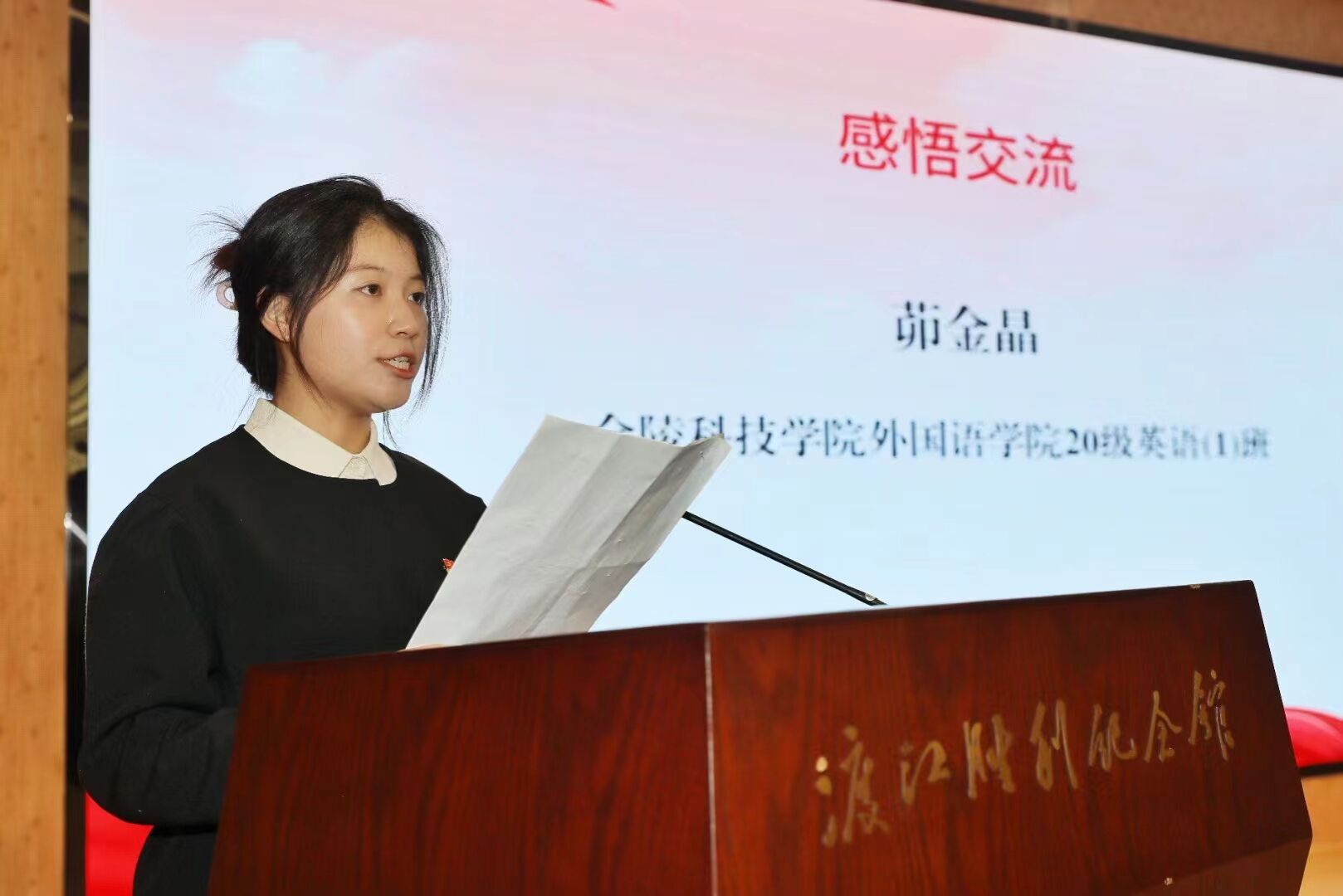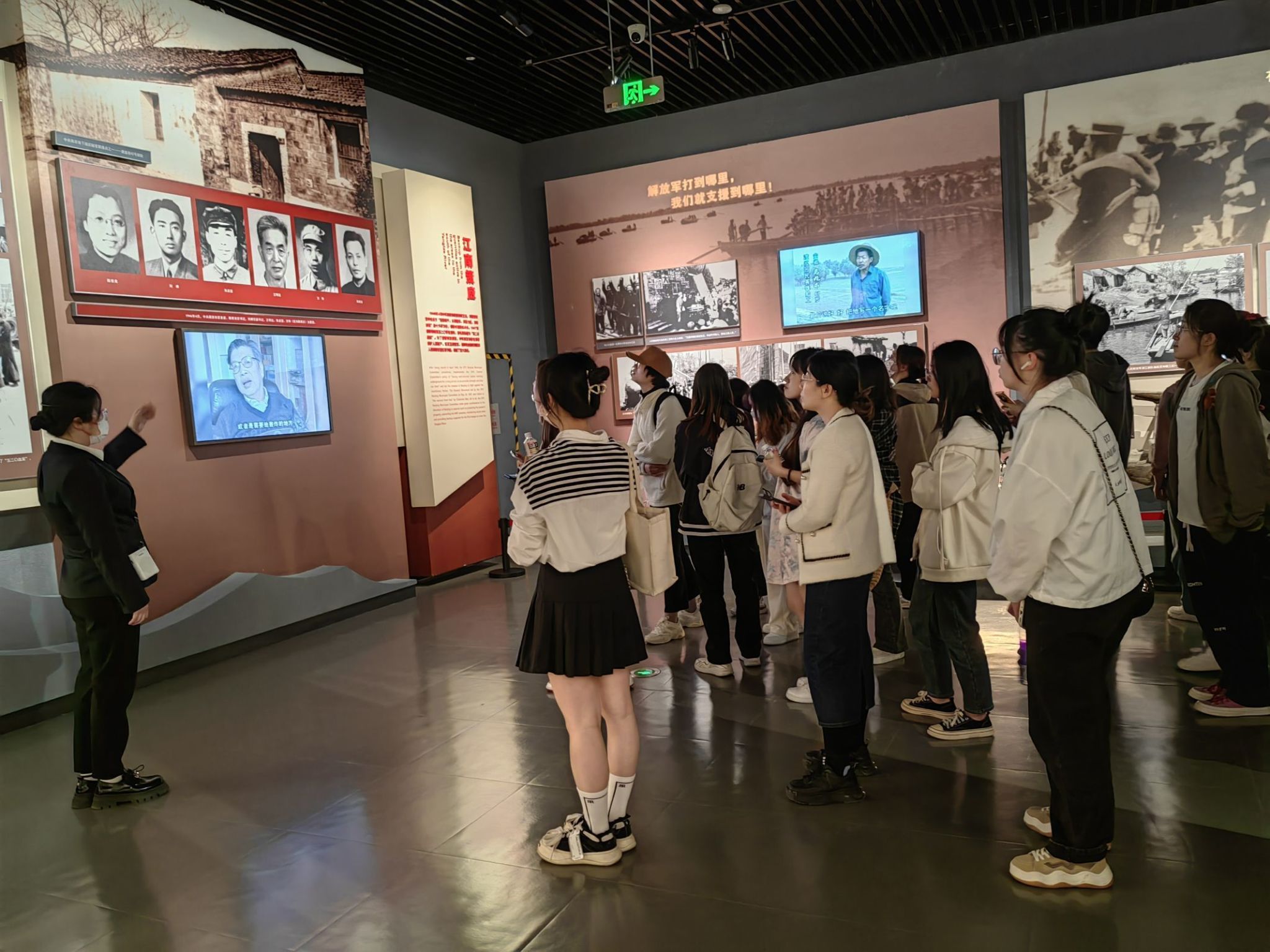 本次活动有红色宣讲、理论解读、感悟交流和参观展览四个环节,为师生们呈现了一场别开生面、生动形象的主题思政课。红色宣讲环节以宣传视频、家书诵读、事迹宣讲等形式,聚焦钱壮飞、冷少农、沈安娜等隐蔽战线的英雄人物,生动展示了革命先辈坚定信仰、坚守使命、严守秘密的英雄事迹。在理论解读环节,渡江胜利纪念馆党支部书记吴小宝研究馆员讲述了隐蔽战线革命先辈的英雄事迹和革命精神。在感悟交流环节,外国语学院20英语(1)班学生党员茆金晶结合工作学习实际,交流了心得体会。最后,在讲解员引导下,师生们参观了“人间正道是沧桑——中国共产党南京历史展”。