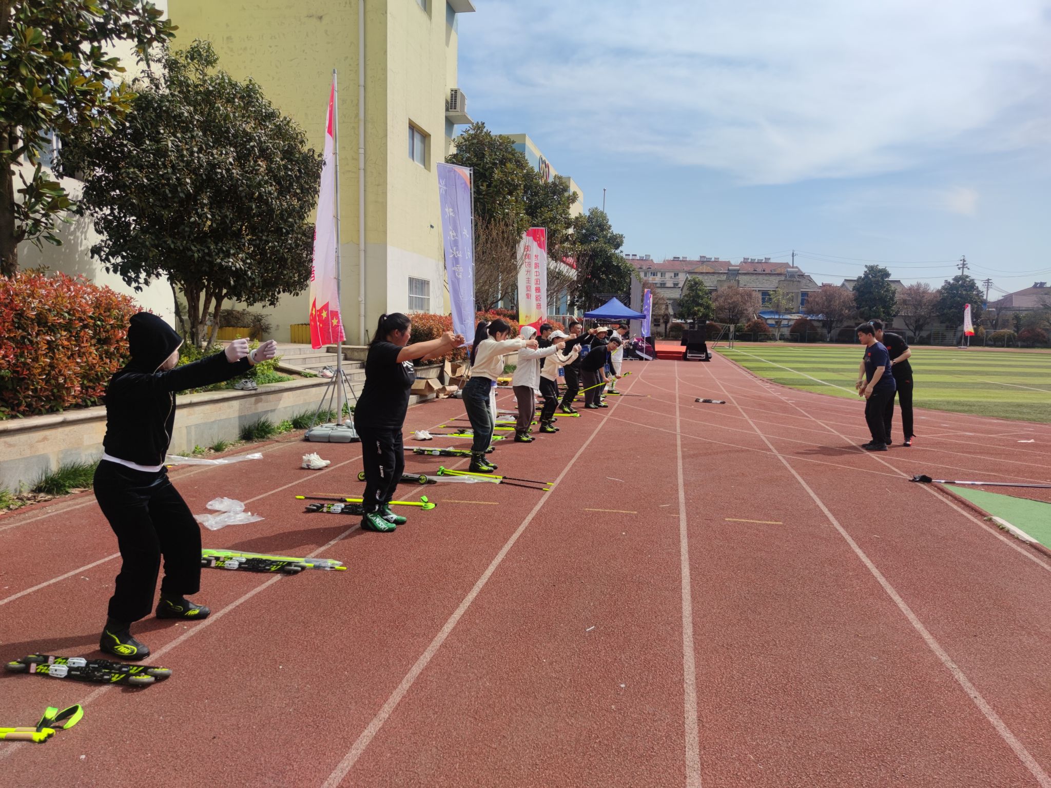 在活动中,吴畏、张东徽与江苏省冰雪运动协会特邀的“十四冬”越野滑雪(群众组)裁判长张广仁,以及中国第一位女子冰壶制冰师张芷源等专业培训教师,就宣传冬奥知识、弘扬北京冬奥精神和培训校园体育老师冰雪项目教练员、裁判员等方面进行了深度交流,并与来自30余所中小学校的80余名骨干体育老师及金牛湖中心小学的150余名学生一起完成了冰壶与陆地冰壶、越野滑雪与陆地越野滑轮等冰雪项目的理论培训和技能实践。