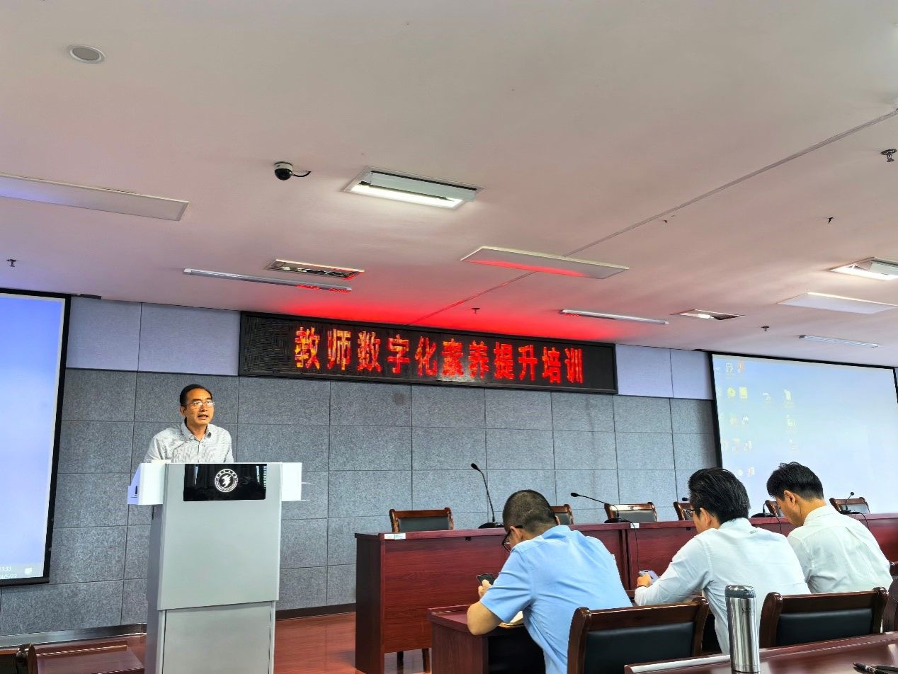 会议第一阶段,实训中心副主任杜新征从教育数字化转型现状、教师数字素养和技术能力结构、教师数字素养提升途径、多元化数字教学方法与手段创新等方面作了专题分享,并以商学院智慧教室为例,详细介绍了总体设计框架,着重演示了翻转课堂、师生互动、资源共享等教学功能模块。