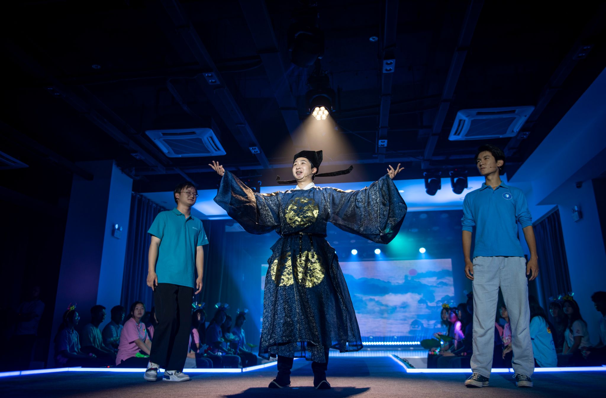 当晚,全省各地10余场富有地域特色的活动同时登上“云端”,为广大人民群众带来了集聚江苏味道、水韵风情的高品质文化“夜生活”。sjb世俱杯话剧团成员张颐君、王鲁宁、鹿育硕、薛云龙参演“经典诵读”情景朗诵《岳阳楼记》《将进酒》,近40名话剧团学生作为现场情景互动嘉宾参与活动。