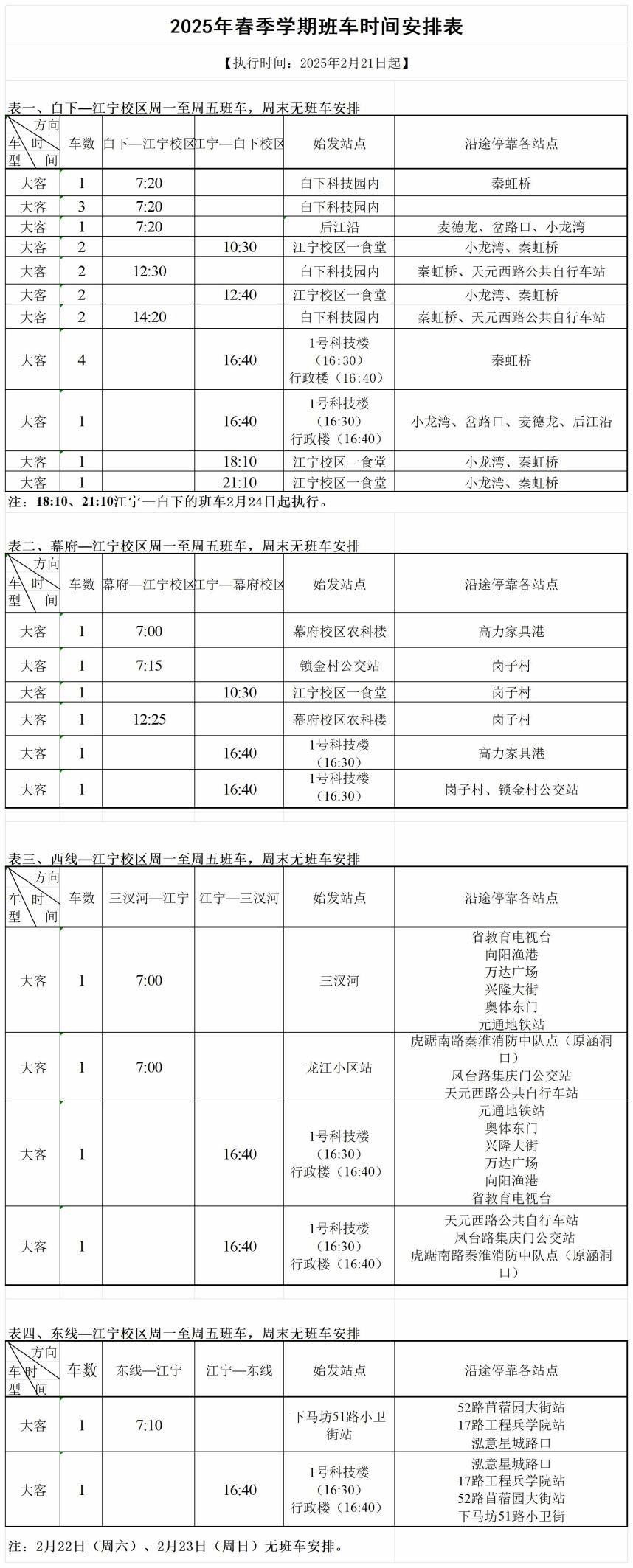 1.该安排自2月21日起执行(2月22日、2月23日为周末,无班车),江宁校区至地铁站接驳班车及18:10、21:10江宁校区至白下校区班车自2月24日起执行;