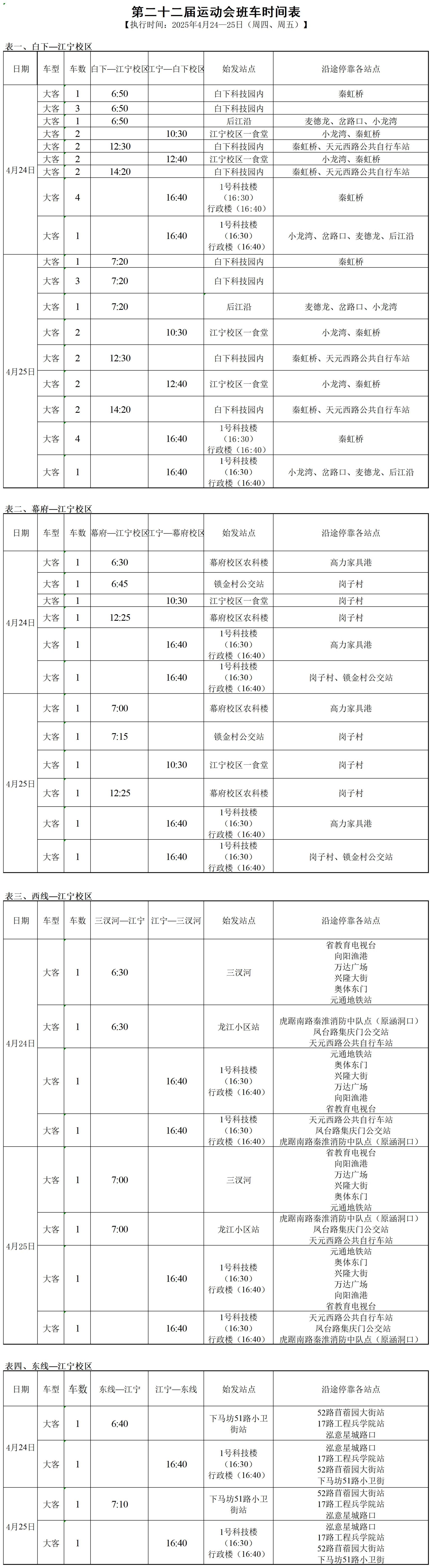 根据学校工作安排,现将第二十二届运动会班车时间安排公布如下: