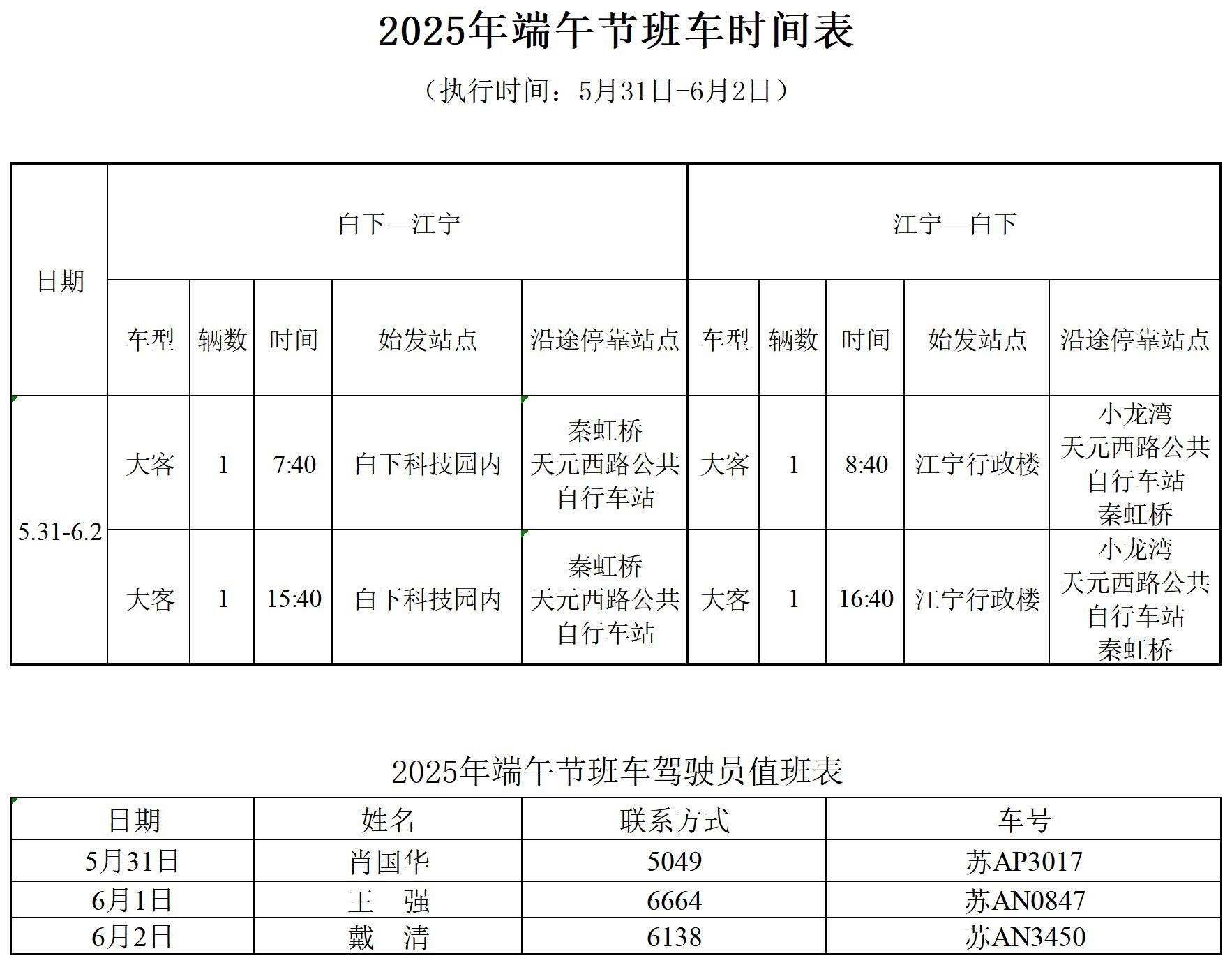 根据2025年端午节放假安排,现将2025年端午节班车时间安排公布如下: