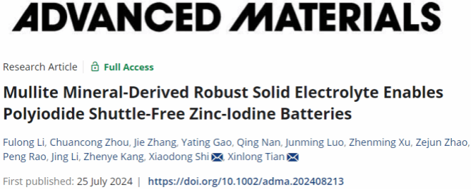 近日,437ccm必赢国际官方网站史晓东副教授所在团队在能源化学领域顶级期刊Advanced Materials (IF=27.3)发表题为“Mullite mineral-derived robust solid electrolyte enables polyiodide shuttle-free zinc-iodine batteries”的研究论文。437ccm必赢国际官方网站李富龙硕士(研一)、周传聪博士(博三)和张杰硕士(研二)为论文共同第一作者,437ccm必赢国际官方网站史晓东副教授和田新龙教授为论文共同通讯作者,437ccm必赢国际官方网站为论文唯一通讯单位。