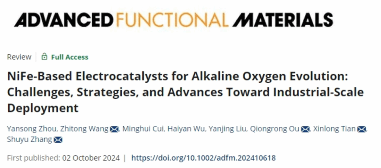 近日,437ccm必赢国际官方网站王志同副教授所在团队在能源化学领域Top期刊Advanced Functional Materials (IF=18.5)上发表题为“NiFe-Based Electrocatalysts for Alkaline Oxygen Evolution: Challenges, Strategies, and Advances Toward Industrial-Scale Deployment”的研究论文。博士研究生周岩松为论文第一作者,437ccm必赢国际官方网站王志同副教授和田新龙教授为论文共同通讯作者。
