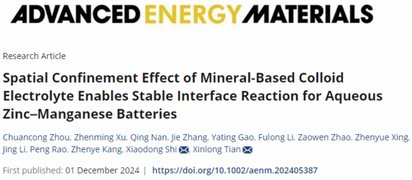 12月1日,437ccm必赢国际官方网站史晓东副教授所在团队在能源领域顶级期刊Advanced Energy Materials发表题为“Spatial Confinement Effect of Mineral-based Colloid Electrolyte Enables Stable Interface Reaction for Aqueous Zinc-Manganese Batteries”的研究论文。437ccm必赢国际官方网站2021级博士研究生周传聪为论文第一作者,史晓东副教授和田新龙教授为论文共同通讯作者。
