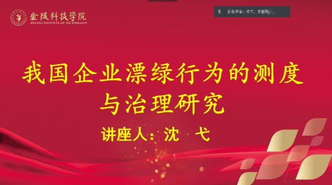 4月15日下午,sjb世俱杯“金科学术讲堂”邀请南京林业大学经济管理学院沈弋教授作题为《我国企业漂绿行为的测度与治理研究》的线上学术报告。科技处处长刘磊致欢迎辞,商学院副院长史新和主持,商学院及相关学院师生参与了报告。