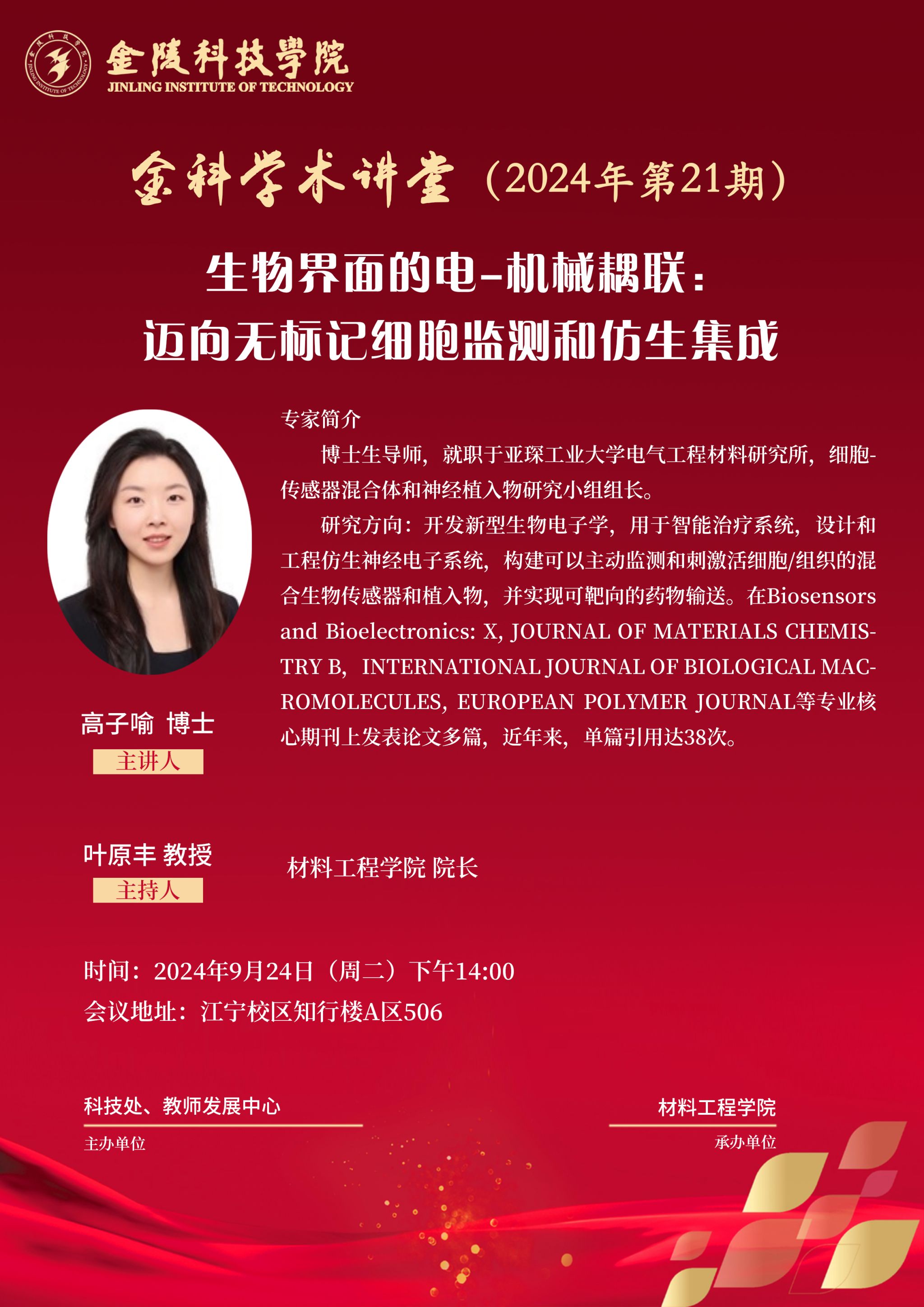 关于举办线下“金科学术讲堂——生物界面的电-机械耦联:迈向无标记细胞监测和仿生集成”学术报告的通知