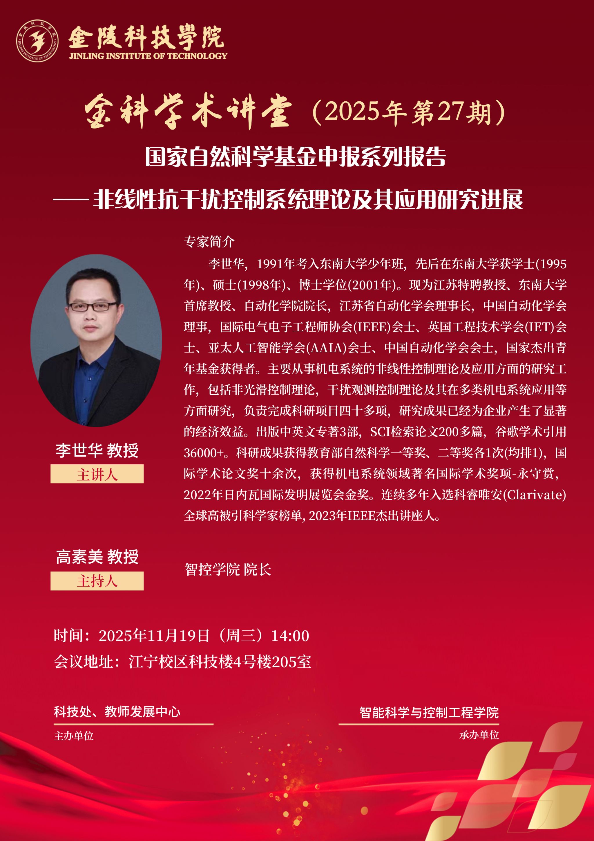 关于举办线下“金科学术讲堂:国家自然科学基金申报系列报告——非线性抗干扰控制系统理论及其应用研究进展”学术报告的通知