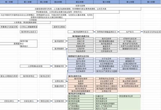 专业核心课程:物理海洋学、海洋生态学、化学海洋学、海洋地质学、海洋物理学、海洋调查与监测技术等。